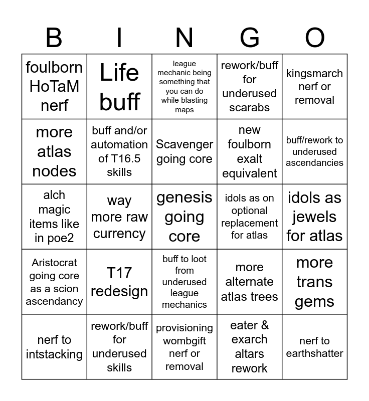 This bingo card has a free space and 24 words: T17 redesign, rework/buff for underused skills, Scavenger going core, nerf to intstacking, kingsmarch nerf or removal, foulborn HoTaM nerf, more atlas nodes, Life buff, idols as on optional replacement for atlas, buff to loot from underused league mechanics, new foulborn exalt equivalent, alch magic items like in poe2, more alternate atlas trees, more trans gems, buff and/or automation of T16.5 skills, eater & exarch altars rework, idols as jewels for atlas, league mechanic being something that you can do while blasting maps, buff/rework to underused ascendancies, way more raw currency, nerf to earthshatter, Aristocrat going core as a scion ascendancy, rework/buff for underused scarabs and provisioning wombgift nerf or removal.
