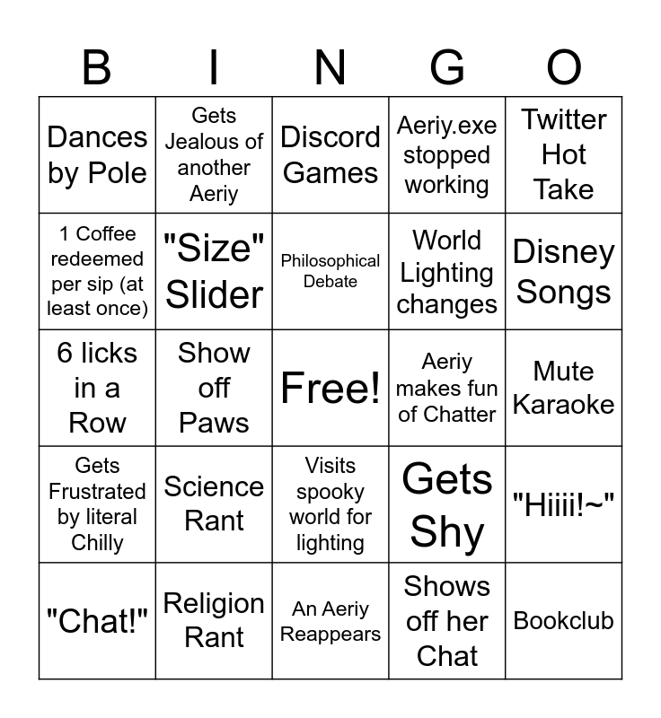 This bingo card has a free space and 24 words: Science Rant, Religion Rant, Philosophical Debate, "Chat!", Twitter Hot Take, Dances by Pole, 1 Coffee redeemed per sip (at least once), Gets Jealous of another Aeriy, Aeriy makes fun of Chatter, Visits spooky world for lighting, World Lighting changes, 6 licks in a Row, Gets Shy, "Hiiii!~", "Size" Slider, Shows off her Chat, Mute Karaoke, Discord Games, Disney Songs, Show off Paws, Bookclub, Gets Frustrated by literal Chilly, Aeriy.exe stopped working and An Aeriy Reappears.