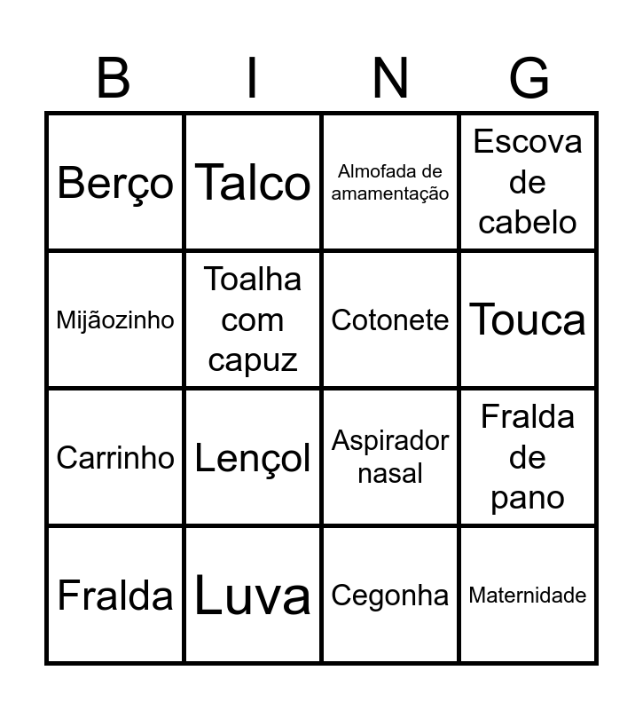 This bingo card has 51 words: Free!, Fralda, Lenço umedecido, Pomada de assadura, Shampoo, Sabonete líquido, Talco, Banheira, Toalha com capuz, Algodão, Cotonete, Escova de cabelo, Body, Macacão, Meia, Sapatinho, Touca, Luva, Babador, Mijãozinho, Fralda de pano, Cueiro, Berço, Carrinho, Móbile, Cobertor, Lençol, Travesseiro, Trocador, Almofada de amamentação, Ninho, Mamadeira, Chupeta, Prendedor de chupeta, Mordedor, Chocalho, Leite, Potinho de papinha, Cadeira de alimentação, Ultrassom, Cegonha, Maternidade, Grávida, Primeiros passos, Chá de bebê, Termômetro, Aspirador nasal, Pente, Tênis de bebê, Mochila de passeio and Lixeirinha de fraldas.