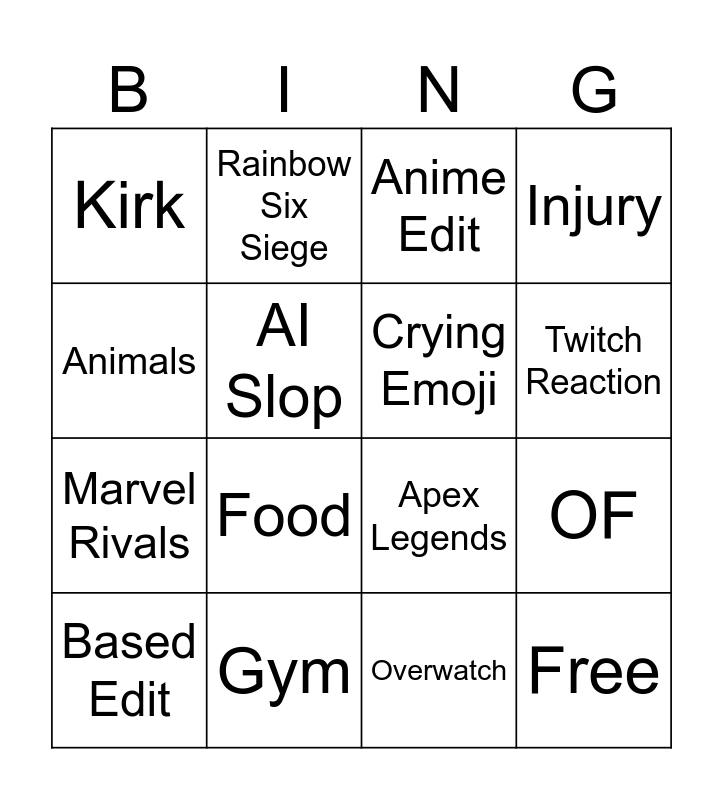 This bingo card has 16 words: Gym, OF, Anime Edit, Kirk, Marvel Rivals, Rainbow Six Siege, Apex Legends, Overwatch, Animals, AI Slop, Based Edit, Injury, Food, Twitch Reaction, Crying Emoji and Free.