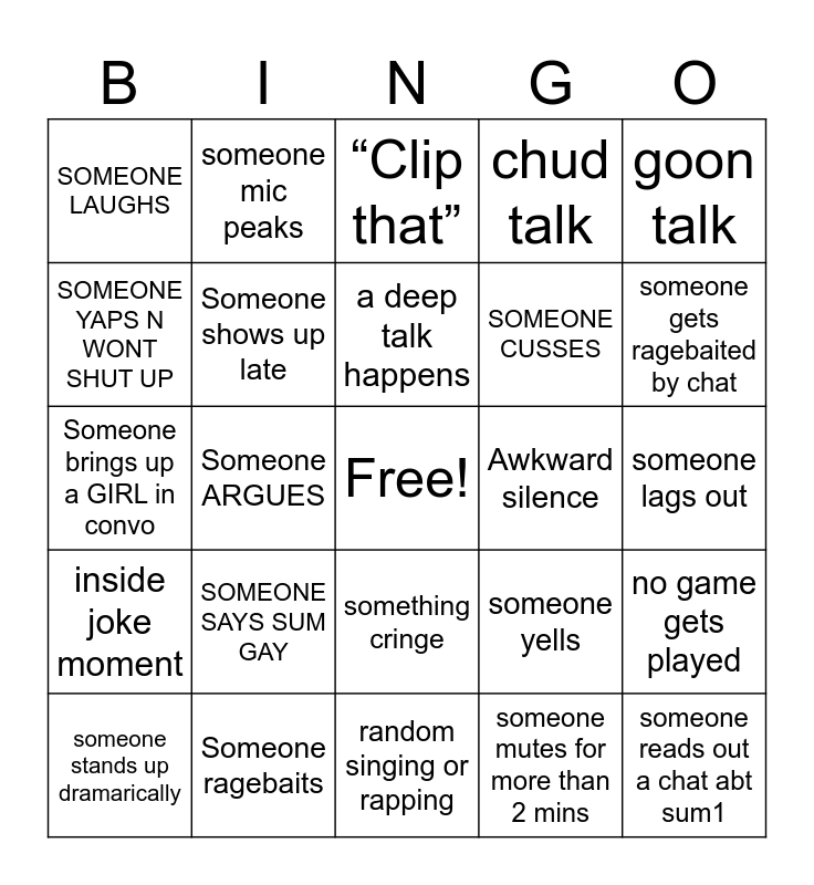 This bingo card has a free space and 24 words: SOMEONE SAYS SUM GAY, Someone ragebaits, a deep talk happens, someone stands up dramarically, goon talk, SOMEONE LAUGHS, SOMEONE YAPS N WONT SHUT UP, someone mic peaks, Awkward silence, something cringe, SOMEONE CUSSES, Someone brings up a GIRL in convo, someone yells, no game gets played, Someone shows up late, someone mutes for more than 2 mins, someone lags out, “Clip that”, someone gets ragebaited by chat, Someone ARGUES, someone reads out a chat abt sum1, inside joke moment, chud talk and random singing or rapping.