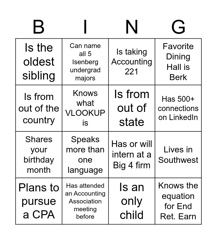 This bingo card has 20 words: Lives in Southwest, Has gone to a concert this last year, Is taking Accounting 221, Has traveled last year, Plans to pursue a CPA, Is from out of the country, Has attended an Accounting Association meeting before, Is the oldest sibling, Shares your birthday month, Can name all 5 Isenberg undergrad majors, Speaks more than one language, Has or will intern at a Big 4 firm, Knows what VLOOKUP is, Knows the equation for End Ret. Earn, Is from out of state, Owns or is wearing UMass merch, Has 500+ connections on LinkedIn, Favorite Dining Hall is Berk, Is an only child and Is doing VITA this semester.