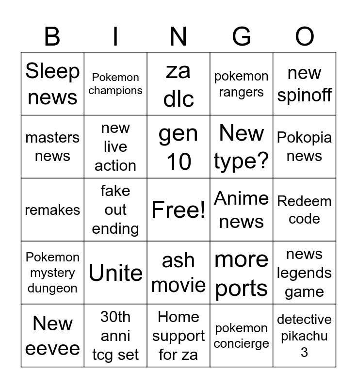 This bingo card has a free space and 24 words: Unite, 30th anni tcg set, gen 10, New eevee, new spinoff, Sleep news, masters news, Pokemon champions, Anime news, ash movie, New type?, remakes, more ports, news legends game, new live action, pokemon concierge, Redeem code, za dlc, Pokopia news, fake out ending, detective pikachu 3, Pokemon mystery dungeon, pokemon rangers and Home support for za.