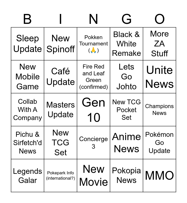 This bingo card has a free space and 24 words: Legends Galar, New TCG Set, Fire Red and Leaf Green (confirmed), Pokopia News, More ZA Stuff, Sleep Update, New Spinoff, Pokken Tournament (🙏), New TCG Pocket Set, Champions News, Collab With A Company, Café Update, Anime News, Pokémon Go Update, New Mobile Game, Pokepark Info (international?), New Movie, Black & White Remake, Unite News, Pichu & Sirfetch'd News, Masters Update, Concierge 3, Lets Go Johto and MMO.