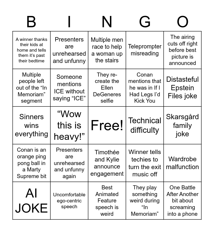 This bingo card has a free space and 24 words: Presenters are unrehearsed and unfunny again, Uncomfortable ego-centric speech, They re-create the Ellen DeGeneres selfie, AI JOKE, The airing cuts off right before best picture is announced, A winner thanks their kids at home and tells them it’s past their bedtime, Multiple people left out of the “In Memoriam” segment, Presenters are unrehearsed and unfunny, Technical difficulty, Timothée and Kylie announce engagement, Conan mentions that he was in If I Had Legs I’d Kick You, Sinners wins everything, Winner tells techies to turn the exit music off, Wardrobe malfunction, Someone mentions ICE without saying “ICE”, They play something weird during “In Memoriam”, Skarsgård family joke, Multiple men race to help a woman up the stairs, Distasteful Epstein Files joke, “Wow this is heavy!”, One Battle After Another bit about screaming into a phone, Conan is an orange ping pong ball in a Marty Supreme bit, Teleprompter misreading and Best Animated Feature speech is weird.