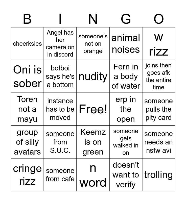 This bingo card has a free space and 24 words: someone from S.U.C., someone from cafe, nudity, cringe rizz, w rizz, cheerksies, Oni is sober, Angel has her camera on in discord, erp in the open, Keemz is on green, Fern in a body of water, Toren not a mayu, someone gets walked in on, someone needs an nsfw avi, botboi says he's a bottom, doesn't want to verify, someone pulls the pity card, someone's not on orange, joins then goes afk the entire time, instance has to be moved, trolling, group of silly avatars, animal noises and n word.