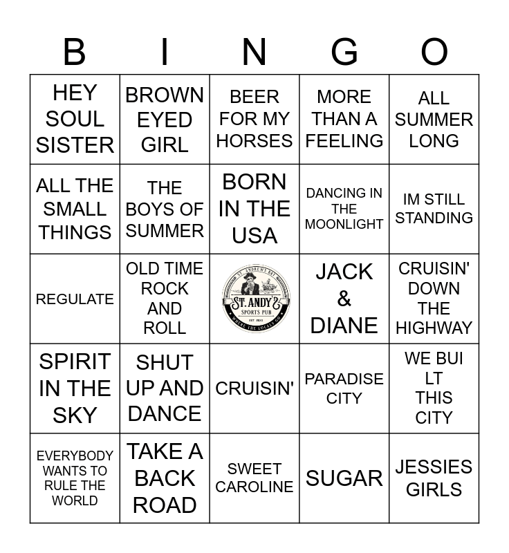 This bingo card has a free space and 51 words: SUMMER OF 69', JESSIES GIRLS, SWEET CHILD O' MINE, SWEET CAROLINE, SHUT UP AND DANCE, UPTOWN GIRL, BROWN EYED GIRL, COME ON EILEEN, ALL THE SMALL THINGS, RAISE YOUR GLASS, THE BOYS OF SUMMER, MORE THAN A FEELING, WE BUILT THIS CITY, PARADISE CITY, IM GONNA BE (500 MILES), CENTERFOLD, BORN IN THE USA, JACK & DIANE, I WANT TO BREAK FREE, ALL SUMMER LONG, OLD TIME ROCK AND ROLL, SUGAR, HEY SOUL SISTER, DANCING IN THE MOONLIGHT, SUGAR, WERE GOIN DOWN, IRIS, IM STILL STANDING, DREAMS, EVERYBODY WANTS TO RULE THE WORLD, BEER FOR MY HORSES, GODS COUNTRY, MY KINDA PARTY, CHECK YES OR NO, NO SHOES, NO SHIRT, NO PROBLEMS, BUY ME A BOAT, TAKE A BACK ROAD, MUD ON THE TIRES, WALK OF LIFE, ONLY WANNA BE WITH YOU, THE SHOW GOES ON, CRUISIN' DOWN THE HIGHWAY, SPIRIT IN THE SKY, ARE YOU GONNA BE MY GIRL, EARFQUAKE, COME AS YOU ARE, LIFES BEEN GOOD, REGULATE, EVERYDAY IS A WINDING ROAD, LIFE IN THE FAST LANE, CRUISIN' and LIFE IS A HIGHWAY.