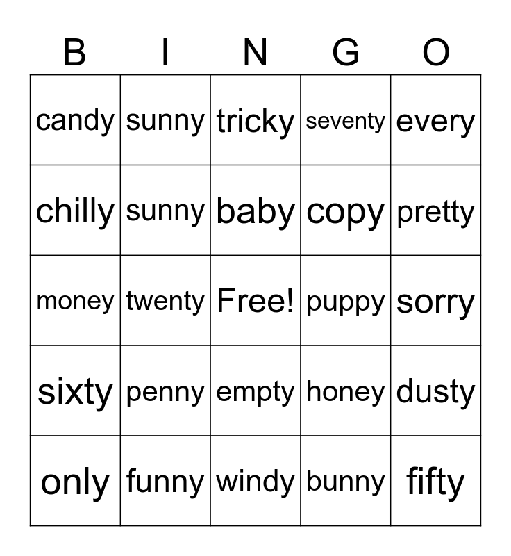 This bingo card has a free space and 24 words: penny, funny, baby, only, every, candy, chilly, sunny, puppy, empty, copy, money, honey, dusty, sunny, bunny, sorry, tricky, pretty, twenty, fifty, sixty, seventy and windy.