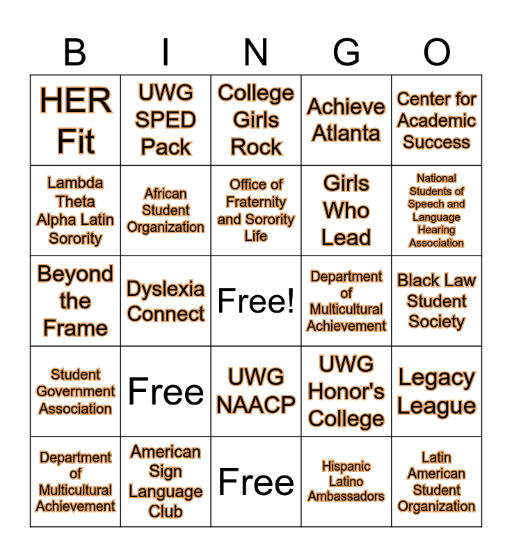 This bingo card has a free space and 24 words: Free, American Sign Language Club, Office of Fraternity and Sorority Life, Department of Multicultural Achievement, Center for Academic Success, HER Fit, Lambda Theta Alpha Latin Sorority, UWG SPED Pack, Department of Multicultural Achievement, UWG NAACP, Girls Who Lead, Beyond the Frame, UWG Honor's College, Legacy League, African Student Organization, Hispanic Latino Ambassadors, Black Law Student Society, College Girls Rock, National Students of Speech and Language Hearing Association, Dyslexia Connect, Latin American Student Organization, Student Government Association, Achieve Atlanta and Free.