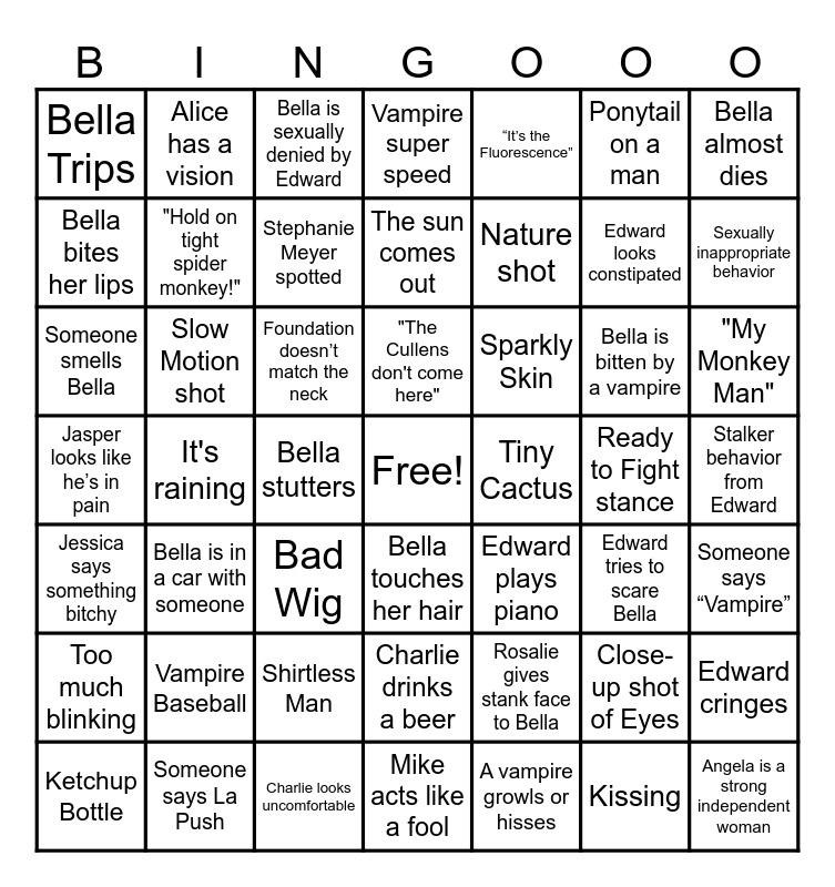 This bingo card has a free space and 49 words: Close-up shot of Eyes, Edward looks constipated, A vampire growls or hisses, It's raining, Foundation doesn’t match the neck, Stalker behavior from Edward, Alice has a vision, Charlie looks uncomfortable, Ponytail on a man, Bella touches her hair, Bella almost dies, Vampire super speed, Bella is bitten by a vampire, Sparkly Skin, Vampire Baseball, Ready to Fight stance, Bella bites her lips, Sexually inappropriate behavior, Edward cringes, “It’s the Fluorescence”, Nature shot, Bella stutters, Bella Trips, "Hold on tight spider monkey!", Ketchup Bottle, Stephanie Meyer spotted, "My Monkey Man", Someone says La Push, "The Cullens don't come here", Slow Motion shot, Old Technology we all miss, Tiny Cactus, Too much blinking, Shirtless Man, Jasper looks like he’s in pain, Edward plays piano, Edward tries to scare Bella, Someone says “Vampire”, Someone smells Bella, Bad Wig, Charlie drinks a beer, Jessica says something bitchy, Angela is a strong independent woman, Mike acts like a fool, The sun comes out, Bella is sexually denied by Edward, Rosalie gives stank face to Bella, Bella is in a car with someone and Kissing.