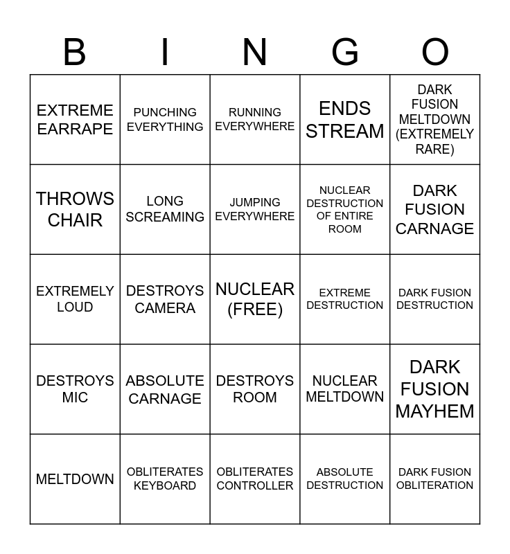 This bingo card has a free space and 24 words: MELTDOWN, ABSOLUTE CARNAGE, JUMPING EVERYWHERE, ABSOLUTE DESTRUCTION, DARK FUSION MELTDOWN (EXTREMELY RARE), EXTREME EARRAPE, PUNCHING EVERYTHING, RUNNING EVERYWHERE, EXTREME DESTRUCTION, DARK FUSION DESTRUCTION, EXTREMELY LOUD, LONG SCREAMING, NUCLEAR MELTDOWN, DARK FUSION MAYHEM, THROWS CHAIR, OBLITERATES KEYBOARD, OBLITERATES CONTROLLER, ENDS STREAM, DARK FUSION CARNAGE, DESTROYS MIC, DESTROYS CAMERA, DESTROYS ROOM, NUCLEAR DESTRUCTION OF ENTIRE ROOM and DARK FUSION OBLITERATION.