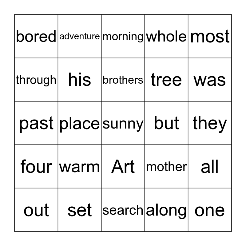This bingo card has 36 words: Alexander, lived, with, his, mother, four, brothers, sisters, most, beautiful, place, whole, Sydney, but, was, bored, one, warm, sunny, morning, they, all, set, out, search, adventure, past, bottle, tree, through, iron, gates, along, Art, Gallery and Road.