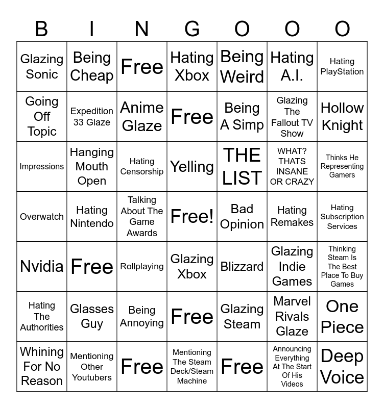 This bingo card has a free space and 48 words: Glazing Steam, Glazing The Fallout TV Show, Mentioning The Steam Deck/Steam Machine, Hating Nintendo, Hating Censorship, Hating Subscription Services, Being Cheap, Mentioning Other Youtubers, Hating A.I., Glazing Xbox, Hating PlayStation, Hating Xbox, WHAT? THATS INSANE OR CRAZY, THE LIST, Hating The Authorities, Hating Remakes, Going Off Topic, Hollow Knight, Marvel Rivals Glaze, Being Weird, Being A Simp, Talking About The Game Awards, Glazing Sonic, Expedition 33 Glaze, One Piece, Anime Glaze, Thinks He Representing Gamers, Whining For No Reason, Yelling, Hanging Mouth Open, Announcing Everything At The Start Of His Videos, Bad Opinion, Thinking Steam Is The Best Place To Buy Games, Glasses Guy, Overwatch, Blizzard, Glazing Indie Games, Impressions, Rollplaying, Being Annoying, Nvidia, Deep Voice, Free, Free, Free, Free, Free and Free.