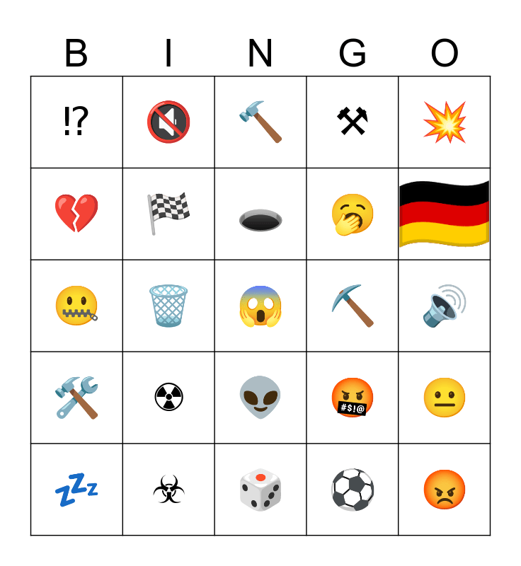 This bingo card has 1 images, a free space and 23 words: ☢, ☣, 🕳, 💤, 💥, ⁉, 💔, 🔇, ⛏, 👽, 🥱, 🤐, 🤬, 😐, 🏁, ⚽, 🔊, 🔨, 🗑, 😡, 🛠, ⚒ and 🎲.