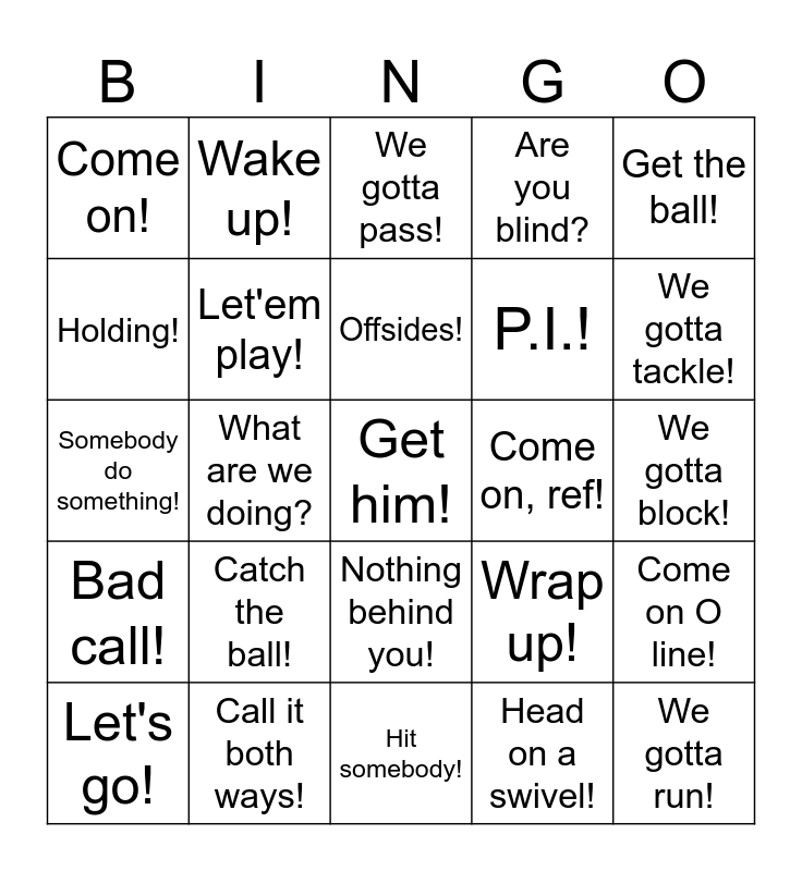 This bingo card has 25 words: Catch the ball!, Hit somebody!, Offsides!, Let's go!, Get the ball!, Come on!, Holding!, Wake up!, Come on, ref!, Nothing behind you!, P.I.!, Somebody do something!, Wrap up!, Come on O line!, Let'em play!, We gotta run!, We gotta block!, We gotta pass!, We gotta tackle!, What are we doing?, Get him!, Call it both ways!, Bad call!, Are you blind? and Head on a swivel!.