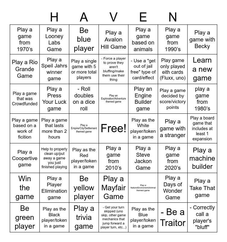 This bingo card has a free space and 82 words: Be red player, Be yellow player, Be blue player, Be green player, Be black player, Be white player, Win the game, Loose the game, Play a machine builder, Play a trivia game, Play a I’m thinking that’s a meeple placement game, Play a 4+ hour board game, Play a game with Becky, Learn a new game, Play a game that’s based just on dice rolls (bang, chupacabra), Play a game from 1970’s, play a game from 1980’s, Play a game from 1990’s, Play a game from 2000’s, Play a game from 2010’s, Play a game from 2020’s, Play a Speil Jahrs winner game, Play game only played eith cards (Fluxx, uno), Play a game based on animals, - Use a "get out of jail free" type of card/effect, - Use a "cancel" type of effect (think counterspells, sabotage cards, etc), - Get your turn skipped (uno skip, other game mechanics that jump forward a player turn, etc...), - Be a Traitor, - Correctly deduce the traitor and/or criminal, - Place a "meeple", - Roll doubles on a dice roll, - Get another player to play into your plan/move/hand... Lose anyways., - Force a player to prove they aren't bluffing/make them use their thing, - Correctly call a player's "bluff", Play a game with a stranger, Play a game that lasts more than 2 hours, Help teach a new player a game, Play a game you have never played before, Play a single game with 5 or more total players, Help to properly clean up/put away a game you just finished playing, Play a Steve Jackon Game, Play a Avalon Hill Game, Play a Fantasy Flight Game, Play a Alderac Entertainment Group Game, Play a Days of Wonder Game, Play a Looney Labs Game, Play a Mayfair Game, Play a Rio Grande Game, Play a boardgame more than three decades old, Play a game (not an expansion) released less than a year ago, Play a board game that includes at least 1 expansion, Play a game that was Crowdfunded, Play a game based on a work of ficition, Play a Deck Builder game, Play a Worker Placement game, Play a Dice Rolling game, Play a Take That game, Play a Storytelling game, Play a Player Elimination game, Play an Engine Builder game, Play a Area Control game, Play a Deduction game, Play a Press Your Luck game, Play a Coopertive game, Play an Asian themed Game, Play a Renaissance/Medieval Fantasy themed Game, Play a Scifi/Space themed game, Play a Pirate themed game, Play a Superhero themed game, Play a War themed game, Play a Nature/Enviroment/Animal themed game, Play a Travel/Tansportation themed game, Play an Exploration/Adventure themed game, Play a Empire/City/Settlement themed game, Play a Racing themed game, Play as the Blue player/token in a game, Play as the Red player/token in a game, Play as the Green player/token in a game, Play as the White player/token in a game, Play as the Black player/token in a game, Play a game decided by score/victory points and Play a game decided by money.