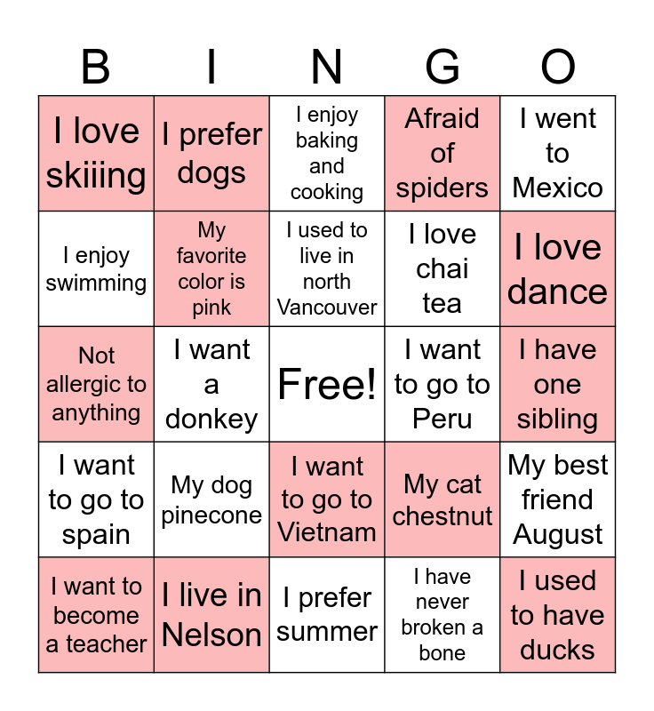 This bingo card has a free space and 24 words: My dog pinecone, I live in Nelson, I used to live in north Vancouver, I want to become a teacher, I went to Mexico, I love skiiing, I enjoy swimming, I prefer dogs, I want to go to Peru, I want to go to Vietnam, I love chai tea, Not allergic to anything, My cat chestnut, My best friend August, My favorite color is pink, I have never broken a bone, I have one sibling, I enjoy baking and cooking, I love dance, I want a donkey, I used to have ducks, I want to go to spain, Afraid of spiders and I prefer summer.