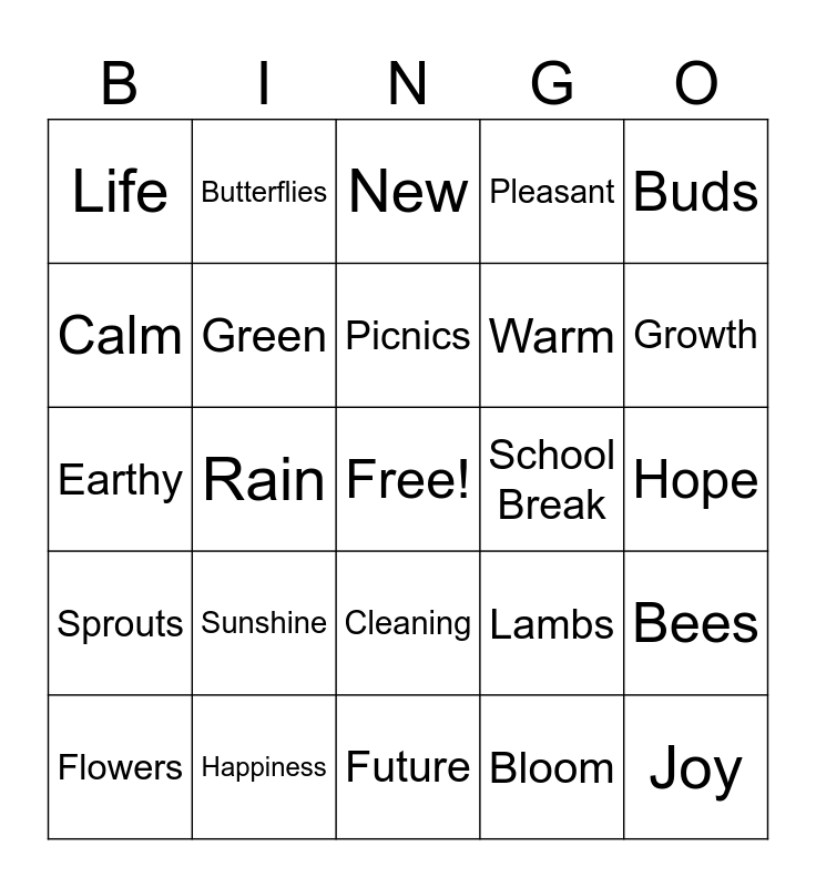 This bingo card has a free space and 29 words: Flowers, Bunnies, Rain, Thunderstorms, Life, New, Green, Sunshine, School Break, Happiness, Hope, Joy, Future, Bloom, Growth, Gardening, Cleaning, Sprouts, Buds, Earthy, Lambs, Chickens, Warm, Calm, Pleasant, Butterflies, Bees, Picnics and Swimming.
