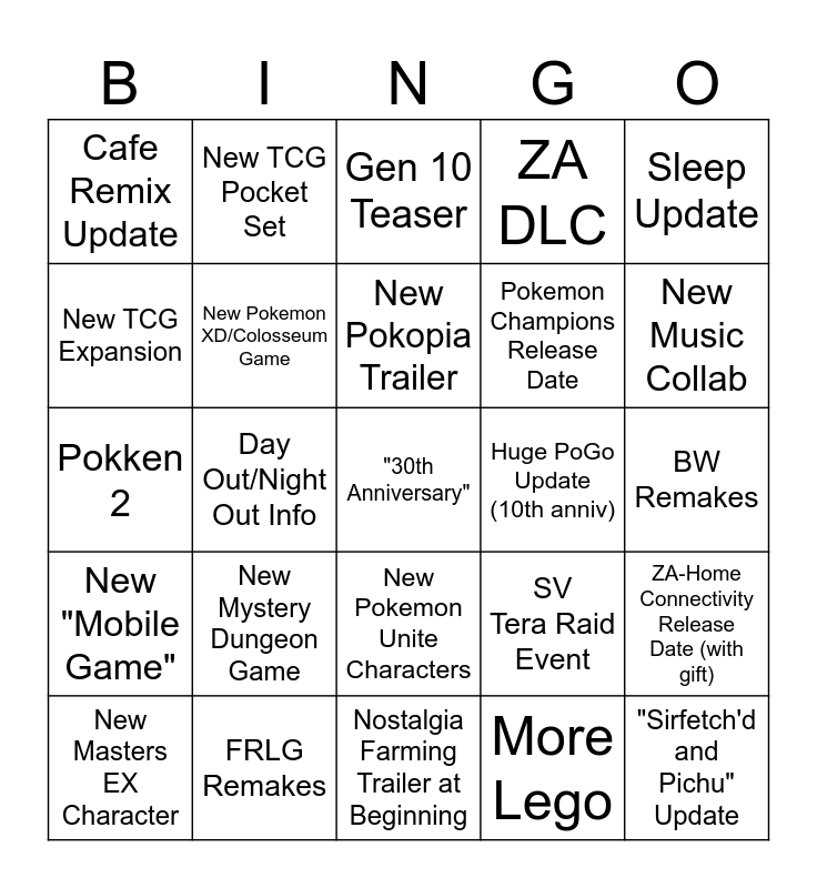This bingo card has a free space and 24 words: New Mystery Dungeon Game, FRLG Remakes, New Pokopia Trailer, New Masters EX Character, Sleep Update, Cafe Remix Update, New TCG Expansion, New TCG Pocket Set, Huge PoGo Update (10th anniv), New Pokemon Unite Characters, Pokemon Champions Release Date, Pokken 2, SV Tera Raid Event, ZA-Home Connectivity Release Date (with gift), New Pokemon XD/Colosseum Game, More Lego, BW Remakes, Gen 10 Teaser, New Music Collab, Day Out/Night Out Info, "Sirfetch'd and Pichu" Update, New "Mobile Game", ZA DLC and Nostalgia Farming Trailer at Beginning.