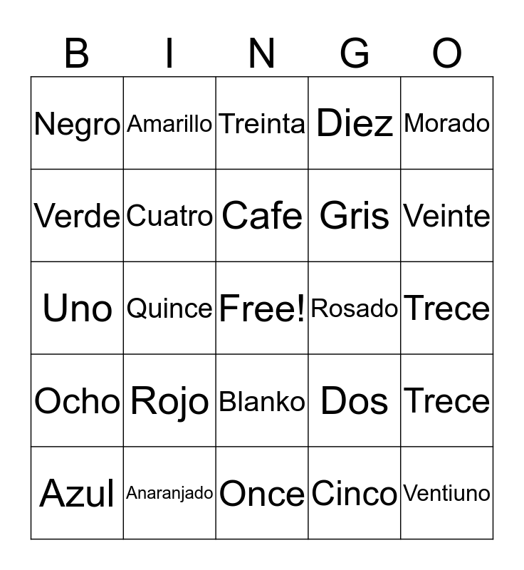 This bingo card has a free space and 24 words: Rojo, Anaranjado, Cafe, Azul, Morado, Negro, Verde, Amarillo, Rosado, Blanko, Gris, Uno, Dos, Trece, Cuatro, Cinco, Trece, Treinta, Veinte, Quince, Ventiuno, Ocho, Diez and Once.