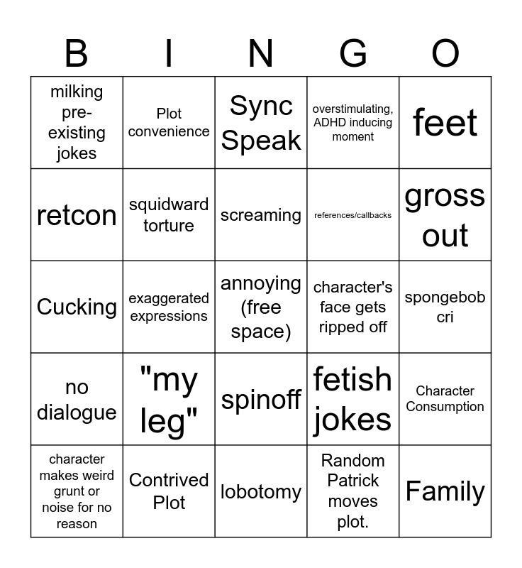 This bingo card has 39 words: bubble bass, nosferatu, next big meme face, squidward torture, character makes weird grunt or noise for no reason, spinoff, screaming, "me do math good", feet, no dialogue, exaggerated expressions, overstimulating, ADHD inducing moment, annoying (free space), spongebob cri, character's face gets ripped off, "my leg", spongebob laughing at absolutely nothing, milking pre-existing jokes, unfunny joke we're expected to laugh at, fetish jokes, retcon, lobotomy, references/callbacks, gross out, Johnny Test (too much sound effects), 4th wall break, Family, Body horror, No Logic, Plot convenience, Michael Bay, Reused Plot, Sync Speak, Contrived Plot, Random Patrick moves plot., Plot Hole, Character Consumption, Cucking and Breaking character.