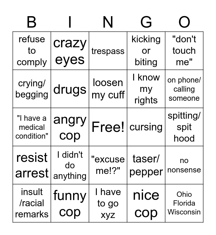 This bingo card has a free space and 24 words: I didn't do anything, funny cop, loosen my cuff, insult /racial remarks, "don't touch me", refuse to comply, crying/ begging, crazy eyes, cursing, "excuse me!?", I know my rights, "I have a medical condition", taser/ pepper, no nonsense, drugs, nice cop, spitting/ spit hood, trespass, on phone/ calling someone, angry cop, Ohio Florida Wisconsin, resist arrest, kicking or biting and I have to go xyz.