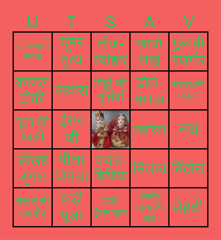 This bingo card has a free space and 40 words: गौरी माता, ईसर जी, घेवर, सिंजारा, मेहंदी, सोलह श्रृंगार, जवारा, गणगौर सवारी, लहरिया, बिंदोरा, काजल टीकी, घूमर नृत्य, बोरला, नथ, पूजा की थाली, पीला पोमचा, मिट्टी की मूर्तियाँ, खायो लाडू, सुहाग गीत, राजस्थानी साफा, बाड़ी पूजा, तीज-त्योहार, गणगौर माता की जय, गुलाबी गणगौर, ढोला मारू, चुंदड़ी, दाल-बाटी, बाजूबंद, पगड़ी, मिट्टी के कुंडे, कुंकुम-चावल, मेवाड़ उत्सव, राजा ईसर दास, मालपुआ, राजस्थानी मांडणा, नखराली गणगौर, पुष्प वर्षा, पायल-बिछिया, ढोल-नगाड़ा and केसरिया बालम.