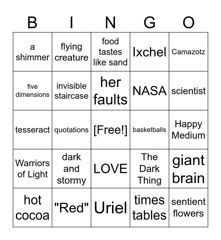 This bingo card has a free space and 24 words: dark and stormy, "Red", her faults, hot cocoa, Camazotz, a shimmer, five dimensions, flying creature, basketballs, LOVE, NASA, tesseract, The Dark Thing, giant brain, invisible staircase, times tables, Happy Medium, food tastes like sand, scientist, quotations, sentient flowers, Warriors of Light, Ixchel and Uriel.
