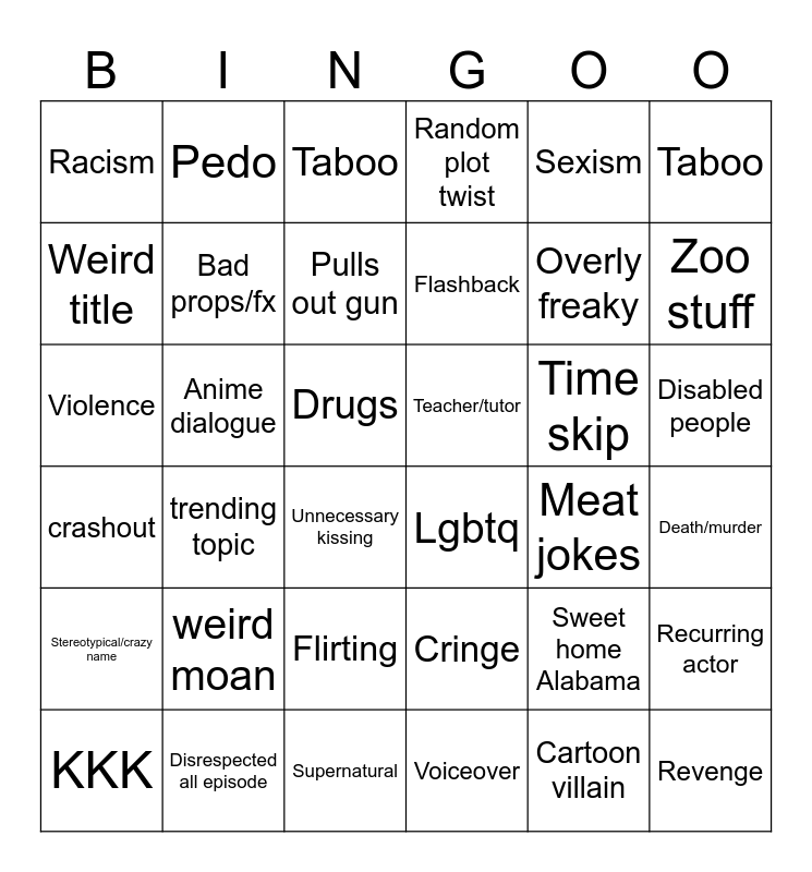 This bingo card has 36 words: crashout, trending topic, Supernatural, Flashback, Time skip, Disabled people, Racism, Disrespected all episode, Taboo, Cringe, Overly freaky, Taboo, Stereotypical/crazy name, Anime dialogue, Pulls out gun, Random plot twist, Sweet home Alabama, Death/murder, Weird title, Bad props/fx, Unnecessary kissing, Lgbtq, Meat jokes, Recurring actor, Violence, Pedo, Drugs, Voiceover, Sexism, Zoo stuff, KKK, weird moan, Flirting, Teacher/tutor, Cartoon villain and Revenge.