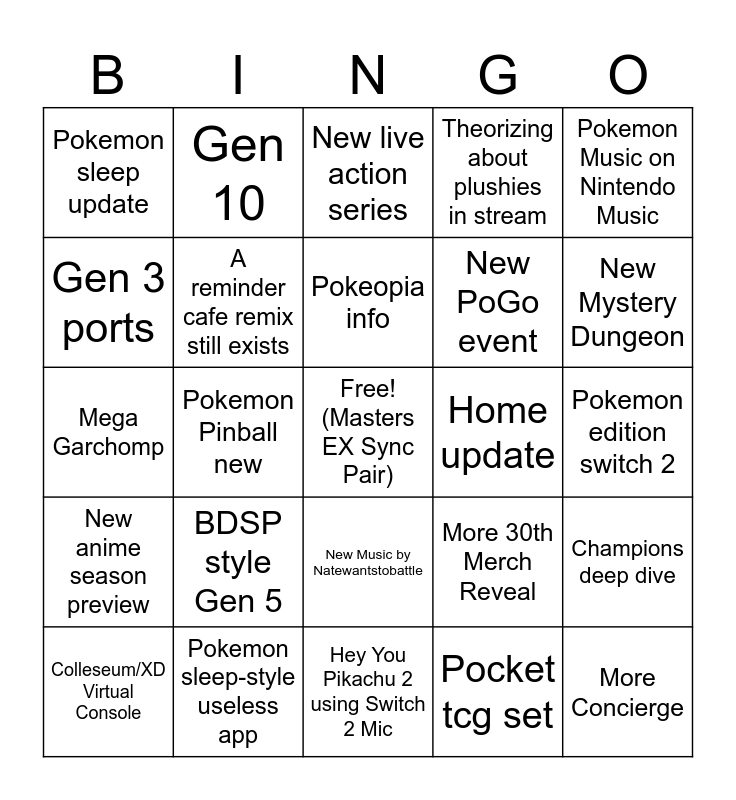 This bingo card has a free space and 24 words: BDSP style Gen 5, Pokemon sleep-style useless app, Pokeopia info, Colleseum/XD Virtual Console, Pokemon Music on Nintendo Music, Pokemon sleep update, Gen 3 ports, Gen 10, Home update, New Music by Natewantstobattle, New PoGo event, Mega Garchomp, More 30th Merch Reveal, Champions deep dive, A reminder cafe remix still exists, Pocket tcg set, Pokemon edition switch 2, New live action series, New Mystery Dungeon, Pokemon Pinball new, More Concierge, New anime season preview, Theorizing about plushies in stream and Hey You Pikachu 2 using Switch 2 Mic.