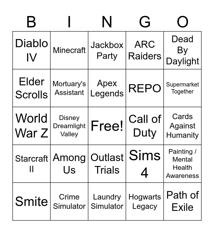 This bingo card has a free space and 31 words: Laundry Simulator, Marvel Rivals, Disney Dreamlight Valley, Golf With Friends, Diablo IV, Jackbox Party, Mortuary's Assistant, Sims 4, Call of Duty, Hogwarts Legacy, Cards Against Humanity, Path of Exile, Cursed Companion, Phasmophobia, Supermarket Together, Fortnite, Painting / Mental Health Awareness, Among Us, Starcraft II, Outlast Trials, Dead By Daylight, Farming Simulator, Smite, Minecraft, REPO, Elder Scrolls, ARC Raiders, World War Z, Crime Simulator, Apex Legends and Grounded.