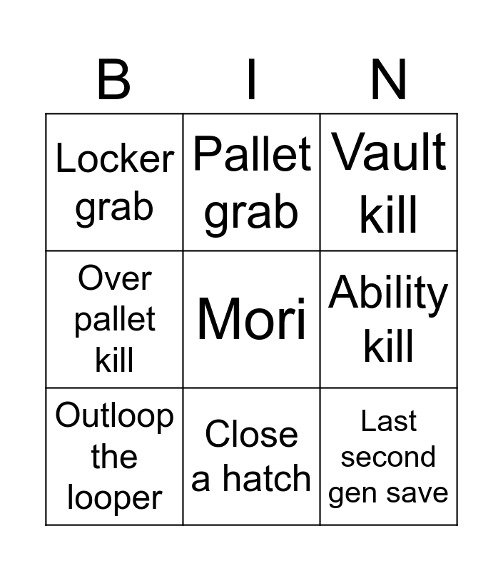 This bingo card has a free space and 8 words: Ability kill, Vault kill, Pallet grab, Outloop the looper, Locker grab, Last second gen save, Over pallet kill and Close a hatch.