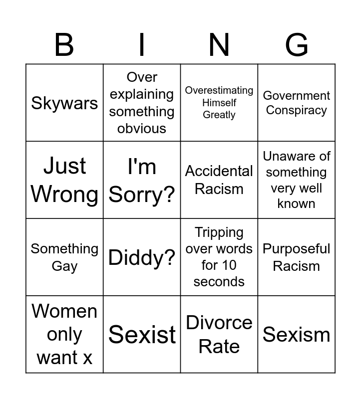 This bingo card has 18 words: Diddy?, Sexism, Overestimating Himself Greatly, Skywars, Tripping over words for 10 seconds, Government Conspiracy, Women only want x, Over explaining something obvious, Unaware of something very well known, Something Gay, Divorce Rate, Just Wrong, Purposeful Racism, I'm Sorry?, Accidental Racism, Introduces Concept Poorly, Sexist and Just get a dog.