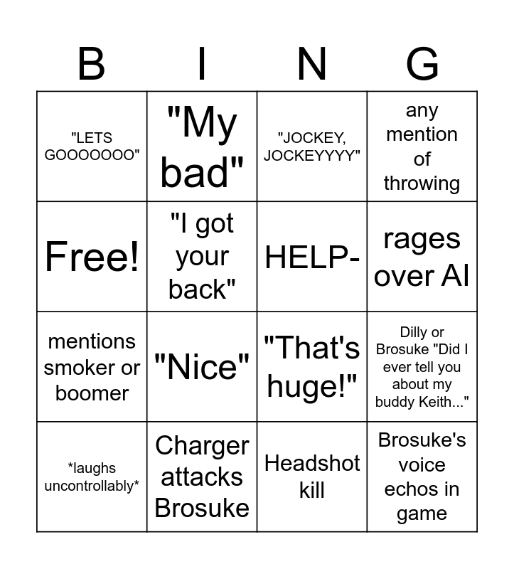 This bingo card has 16 words: Charger attacks Brosuke, Dilly or Brosuke "Did I ever tell you about my buddy Keith...", "JOCKEY, JOCKEYYYY", "LETS GOOOOOOO", mentions smoker or boomer, "My bad", "That's huge!", Headshot kill, Free!, "I got your back", *laughs uncontrollably*, any mention of throwing, "Nice", rages over AI, HELP- and Brosuke's voice echos in game.