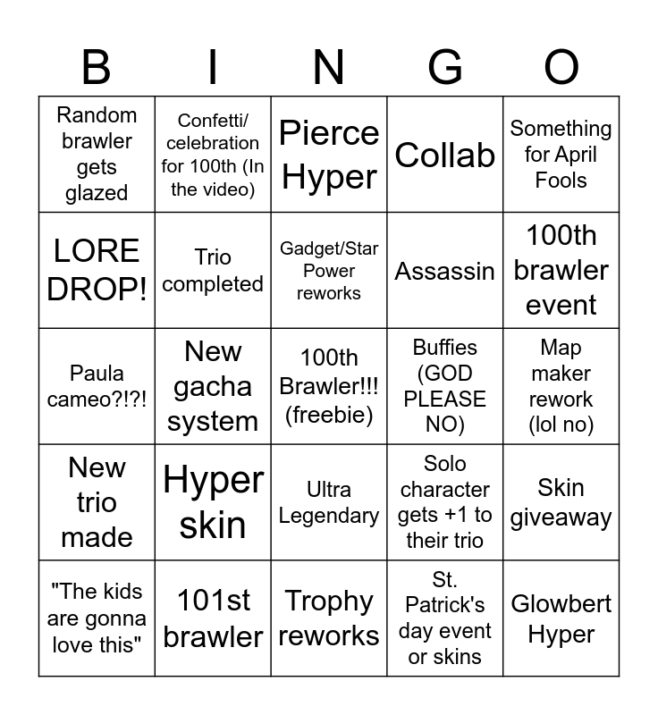 This bingo card has a free space and 24 words: Hyper skin, 101st brawler, Gadget/Star Power reworks, "The kids are gonna love this", Something for April Fools, Random brawler gets glazed, LORE DROP!, Confetti/ celebration for 100th (In the video), Buffies (GOD PLEASE NO), Ultra Legendary, Assassin, Paula cameo?!?!, Solo character gets +1 to their trio, Skin giveaway, Trio completed, St. Patrick's day event or skins, Map maker rework (lol no), Pierce Hyper, 100th brawler event, New gacha system, Glowbert Hyper, New trio made, Collab and Trophy reworks.