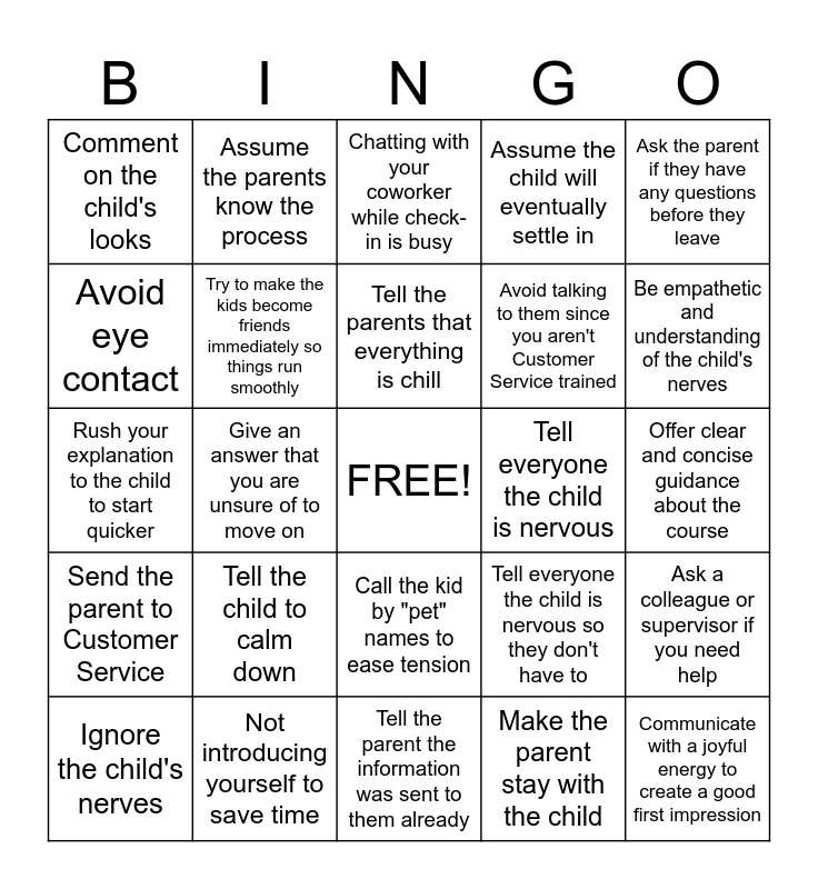 This bingo card has a free space and 24 words: Ignore the child's nerves, Tell the child to calm down, Tell the parents that everything is chill, Make the parent stay with the child, Ask the parent if they have any questions before they leave, Comment on the child's looks, Assume the parents know the process, Chatting with your coworker while check-in is busy, Tell everyone the child is nervous, Offer clear and concise guidance about the course, Rush your explanation to the child to start quicker, Try to make the kids become friends immediately so things run smoothly, Tell everyone the child is nervous so they don't have to, Ask a colleague or supervisor if you need help, Avoid eye contact, Not introducing yourself to save time, Tell the parent the information was sent to them already, Assume the child will eventually settle in, Be empathetic and understanding of the child's nerves, Send the parent to Customer Service, Give an answer that you are unsure of to move on, Call the kid by "pet" names to ease tension, Avoid talking to them since you aren't Customer Service trained and Communicate with a joyful energy to create a good first impression.