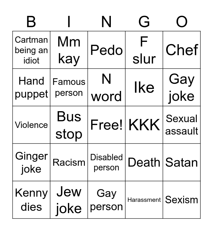 This bingo card has a free space and 24 words: Racism, Jew joke, N word, Kenny dies, Chef, Cartman being an idiot, Hand puppet, Mm kay, KKK, Disabled person, Ike, Violence, Death, Satan, Famous person, Harassment, Sexual assault, Pedo, Gay joke, Bus stop, Sexism, Ginger joke, F slur and Gay person.