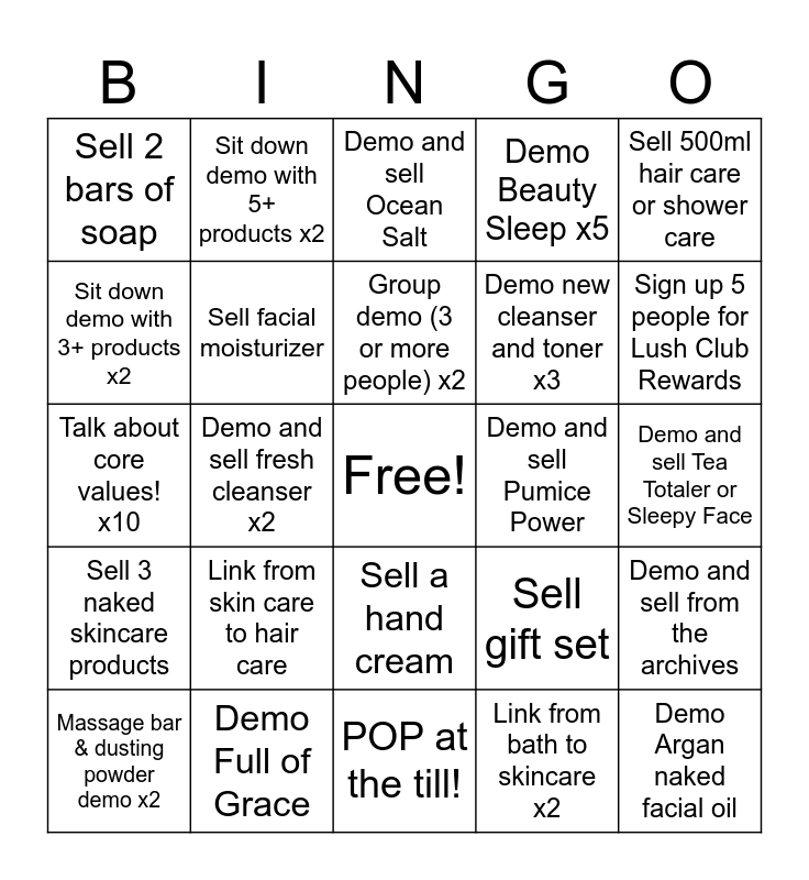 This bingo card has a free space and 24 words: Link from skin care to hair care, Demo Full of Grace, Group demo (3 or more people) x2, Massage bar & dusting powder demo x2, Sell 500ml hair care or shower care, Sell 2 bars of soap, Sit down demo with 3+ products x2, Sit down demo with 5+ products x2, Demo and sell Pumice Power, Sell a hand cream, Demo new cleanser and toner x3, Talk about core values! x10, Sell gift set, Demo and sell from the archives, Sell facial moisturizer, Link from bath to skincare x2, Demo and sell Tea Totaler or Sleepy Face, Demo and sell Ocean Salt, Sign up 5 people for Lush Club Rewards, Demo and sell fresh cleanser x2, Demo Argan naked facial oil, Sell 3 naked skincare products, Demo Beauty Sleep x5 and POP at the till!.