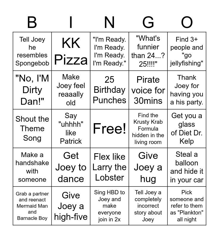 This bingo card has a free space and 24 words: Get Joey to dance, Give Joey a high-five, 25 Birthday Punches, Grab a partner and reenact Mermaid Man and Barnacle Boy, Find 3+ people and "go jellyfishing", Tell Joey he resembles Spongebob, "No, I'M Dirty Dan!", KK Pizza, Find the Krusty Krab Formula hidden in the living room, Flex like Larry the Lobster, Pirate voice for 30mins, Shout the Theme Song, Give Joey a hug, Steal a balloon and hide it in your car, Make Joey feel reaaally old, Tell Joey a completely incorrect story about Joey, Get you a glass of Diet Dr. Kelp, "I'm Ready. I'm Ready. I'm Ready. I'm Ready.", Thank Joey for having you a his party., Say "uhhhh" like Patrick, Pick someone and refer to them as "Plankton" all night, Make a handshake with someone, "What's funnier than 24...? 25!!!!" and Sing HBD to Joey and make everyone join in 2x.