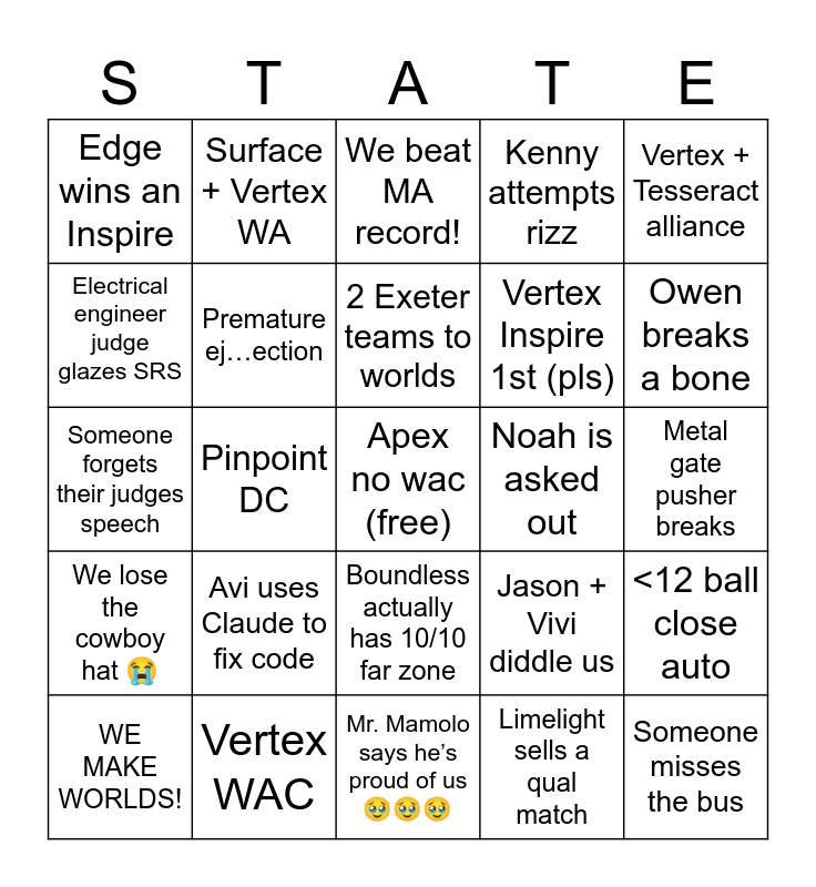 This bingo card has a free space and 24 words: WE MAKE WORLDS!, Avi uses Claude to fix code, 2 Exeter teams to worlds, Limelight sells a qual match, Vertex + Tesseract alliance, Edge wins an Inspire, Surface + Vertex WA, We beat MA record!, Noah is asked out, Metal gate pusher breaks, Someone forgets their judges speech, Premature ej…ection, Jason + Vivi diddle us, <12 ball close auto, Electrical engineer judge glazes SRS, Vertex WAC, Mr. Mamolo says he’s proud of us 🥹🥹🥹, Kenny attempts rizz, Owen breaks a bone, We lose the cowboy hat 😭, Pinpoint DC, Boundless actually has 10/10 far zone, Vertex Inspire 1st (pls) and Someone misses the bus.
