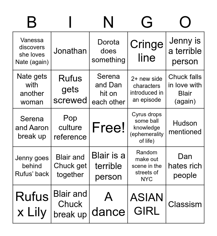 This bingo card has a free space and 24 words: Blair and Chuck get together, Blair and Chuck break up, Serena and Dan hit on each other, Rufus x Lily, Jenny is a terrible person, Vanessa discovers she loves Nate (again), Nate gets with another woman, Jonathan, Cyrus drops some ball knowledge (ephemerality of life), Blair is a terrible person, 2+ new side characters introduced in an episode, Serena and Aaron break up, Random make out scene in the streets of NYC, Dan hates rich people, Rufus gets screwed, ASIAN GIRL, Hudson mentioned, Dorota does something, Chuck falls in love with Blair (again), Pop culture reference, Classism, Jenny goes behind Rufus’ back, Cringe line and A dance.