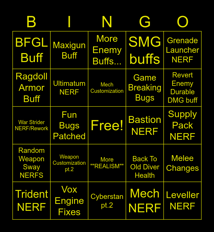 This bingo card has a free space and 24 words: Trident NERF, Weapon Customization pt.2, Mech Customization, Mech NERF, Grenade Launcher NERF, BFGL Buff, Maxigun Buff, More Enemy Buffs..., Bastion NERF, Supply Pack NERF, War Strider NERF/Rework, Ultimatum NERF, Back To Old Diver Health, Melee Changes, Ragdoll Armor Buff, Vox Engine Fixes, Cyberstan pt.2, SMG buffs, Revert Enemy Durable DMG buff, Random Weapon Sway NERFS, Fun Bugs Patched, More ""REALISM"", Game Breaking Bugs and Leveller NERF.