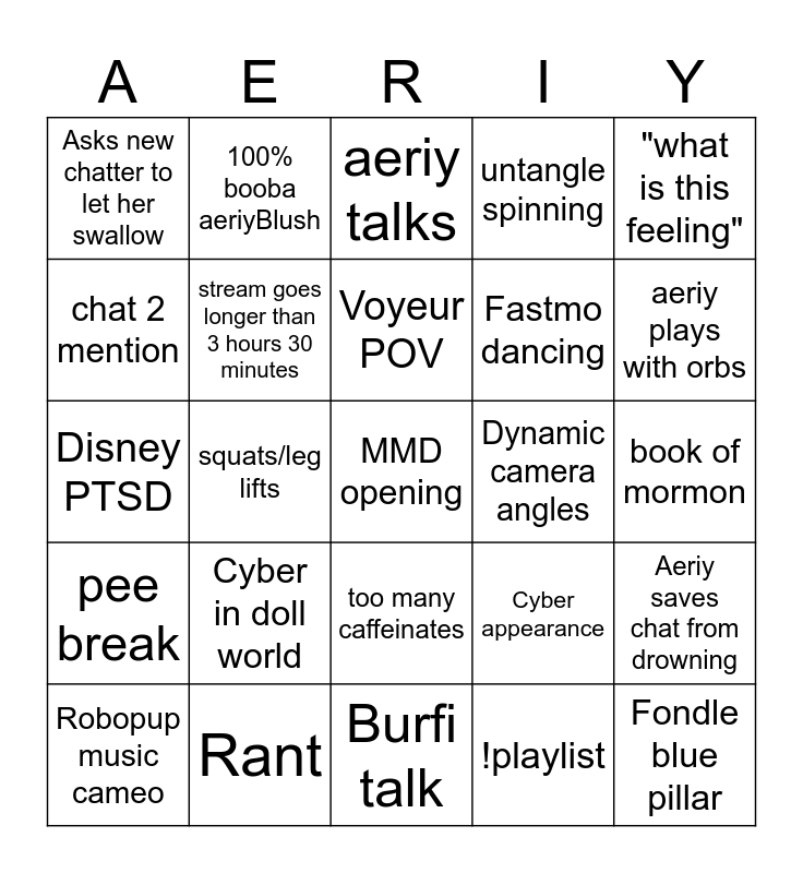 This bingo card has a free space and 24 words: Cyber in doll world, Rant, Voyeur POV, Robopup music cameo, "what is this feeling", Asks new chatter to let her swallow, chat 2 mention, 100% booba aeriyBlush, Dynamic camera angles, too many caffeinates, Fastmo dancing, Disney PTSD, Cyber appearance, Aeriy saves chat from drowning, stream goes longer than 3 hours 30 minutes, !playlist, book of mormon, aeriy talks, aeriy plays with orbs, squats/leg lifts, Fondle blue pillar, pee break, untangle spinning and Burfi talk.