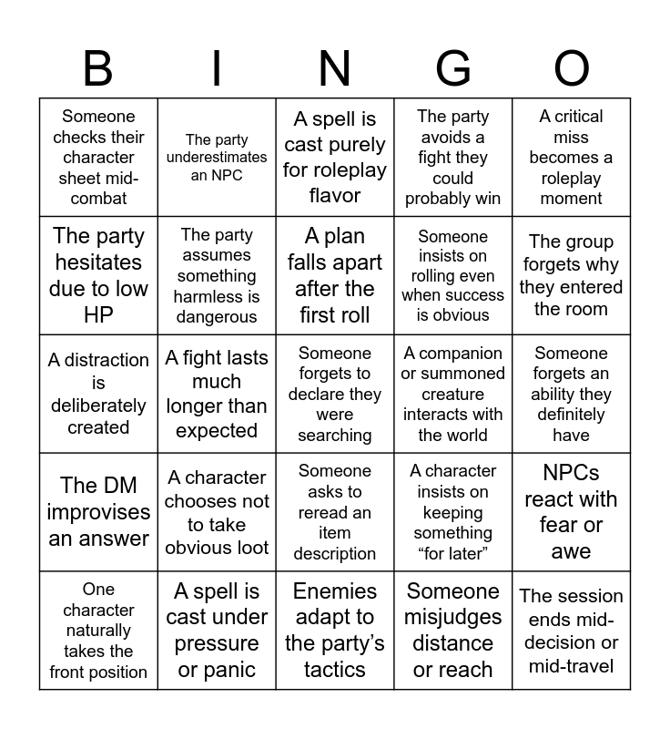 This bingo card has 126 words: Free!, Supplies suddenly start mattering, A spell is cast just to look impressive, The party debates looting now or later, Someone forgets an NPC’s name, A weapon is dropped or knocked away, The DM improvises an answer, A single roll changes the direction of the session, Someone misjudges distance or reach, A spell changes the tone of a scene, A fight ends quicker than expected, The party pauses to reassess the situation, Someone risks opportunity attacks intentionally, A mundane item solves a major problem, A character fails a save they expected to pass, The party debates who opens the door, A spell is cast under pressure or panic, The party assumes something is a trap (it isn’t), Someone asks “Can I do this?” during their turn, A dangerous area is underestimated, The session ends mid-decision or mid-travel, A distraction is deliberately created, A reaction is used at the perfect moment, A character roleplays exhaustion or stress, A tool is used creatively, A plan falls apart after the first roll, The party avoids a fight they could probably win, A short rest is interrupted, A spell is used very literally, Someone reorganizes gear during a rest, NPCs react with fear or awe, Someone acts before the plan is finished, A fight lasts much longer than expected, A character chooses not to take obvious loot, The party argues about who should lead, A spell creates unexpected noise or light, Someone forgets concentration ends, A bad roll creates a new complication, The party splits up briefly, Someone treats wounds manually instead of magically, Someone checks their character sheet mid-combat, A skill check is used instead of attacking, A character blocks an enemy’s escape route, A spell is used to communicate instead of fight, A safe area is treated like a danger zone, A character goes prone on purpose, The same action is used multiple turns in a row, A critical miss becomes a roleplay moment, Someone asks if something is flammable, A character explains how something should work, A spell is cast to solve a non-combat problem, A character climbs something questionable, The party debates marching order again, A low-HP character becomes very cautious, A simple solution works surprisingly well, Someone forgets they already used their bonus action, An attack misses by 1, A spell fails due to line of sight, Someone scouts ahead and immediately retreats, A companion or summoned creature interacts with the world, The party hesitates due to low HP, Someone pockets an item quietly, A weak effect still turns out to matter, One character protects another without hesitation, Someone asks how vision or darkness works, The party debates killing vs sparing an enemy, A character refuses help for roleplay reasons, Someone asks to reread an item description, The environment is used as a weapon, Someone forgets an ability they definitely have, A spell changes how the battlefield looks, The party forgets a spell has verbal or somatic components, Magic is described as emotional or instinctive, A long rest feels unsafe, The party argues about chasing an enemy, An NPC reacts strongly to magic being used, Terrain is used to gain an advantage, Someone attempts diplomacy mid-combat, The party worries about reputation, A spell is used to gather information, A complicated plan is abandoned, Someone casts Detect Magic “just in case”, Notes are taken about a place or creature, The DM checks a rule and allows it, One character naturally takes the front position, Guards or authority figures become involved, A cantrip finishes off an enemy, Light sources are forgotten at a bad time, Enemies adapt to the party’s tactics, Retreat is chosen over pushing forward, A spell is used in an unexpected way, A character examines a corpse closely, A short debate turns into a long argument, The party assumes something harmless is dangerous, A character takes damage meant for someone else, A spell is cast purely for roleplay flavor, A weak enemy becomes a bigger threat than expected, Someone asks “Is that my whole turn?”, A spell creates light or sound at the worst time, The party spends 10 minutes planning a 10-second encounter, Someone forgets to declare they were searching, A door is opened very cautiously… and nothing happens, A character insists on keeping something “for later”, An NPC gives vague or cryptic advice, Someone tries to intimidate something that clearly doesn’t care, The party debates splitting the treasure evenly, A character checks for hidden compartments, A simple question turns into a long rules discussion, The group forgets why they entered the room, An enemy surrenders unexpectedly, Someone tries to bargain mid-fight, A character inspects the ceiling for threats, The party tests something by throwing an object at it, Someone volunteers another character for a risky task, A suspicious object turns out to be harmless, A harmless object is treated like it’s cursed, The party double-checks a locked door, Someone dramatically describes their final blow, An NPC lies poorly, The group forgets to ask an obvious question, Someone insists on rolling even when success is obvious, A character keeps watch during a rest, The party backtracks to check something again, A minor detail becomes the focus of the session, The party underestimates an NPC and The party overestimates an NPC.