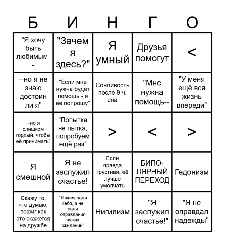 This bingo card has 25 words: Я не заслужил счастье!, Нигилизм, Сонливость после 9 ч. сна, Скажу то, что думаю, пофиг как это скажется на дружбе, <, "Я хочу быть любимым--, --но я не знаю достоин ли я", "Зачем я здесь?", <, Если правда грустная, её лучше умолчать, "Мне нужна помощь--, --но я слишком гордый, чтобы её принимать", БИПО-ЛЯРНЫЙ ПЕРЕХОД, Гедонизм, "Если мне нужна будет помощь - я её попрошу", "Я не оправдал надежды", >, Я умный, "У меня ещё вся жизнь впереди", "Попытка не пытка, попробуем ещё раз", >, "Я живу ради себя, а не ради оправдания чужих ожиданий", Я смешной, Друзья помогут and "Я заслужил счастье!".