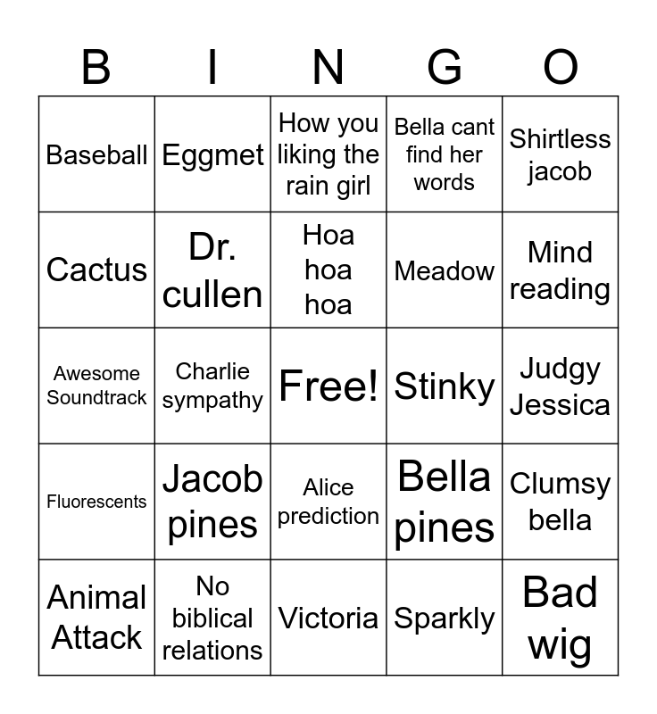 This bingo card has a free space and 32 words: Sparkly, Lip bite, Charlie sympathy, Sav imprints, Fluorescents, Dr. cullen, Shirtless jacob, Clumsy bella, Eggmet, Vegetarian, Hoa hoa hoa, How you liking the rain girl, RBF Rosalie, Fashionista Alice, Stinky, Lore, Animal Attack, Awesome Soundtrack, Alice prediction, Jacob pines, Bella pines, Edward pines, Judgy Jessica, No biblical relations, Bad wig, Bella cant find her words, Meadow, Cactus, Baseball, Victoria, Bella tells charlie shes leaving and Mind reading.