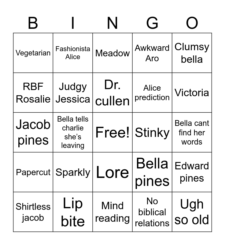This bingo card has a free space and 24 words: Sparkly, Lip bite, Dr. cullen, Shirtless jacob, Clumsy bella, Vegetarian, RBF Rosalie, Fashionista Alice, Stinky, Lore, Alice prediction, Jacob pines, Bella pines, Edward pines, Judgy Jessica, No biblical relations, Bella cant find her words, Meadow, Victoria, Bella tells charlie she’s leaving, Ugh so old, Papercut, Awkward Aro and Mind reading.