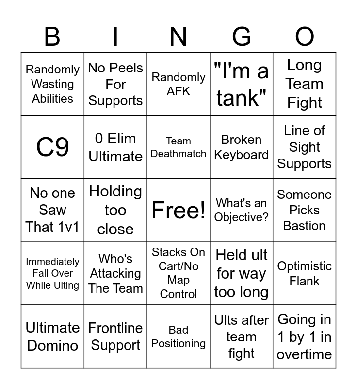 This bingo card has a free space and 24 words: Who's Attacking The Team, Frontline Support, Team Deathmatch, Ultimate Domino, Long Team Fight, Randomly Wasting Abilities, C9, No Peels For Supports, What's an Objective?, Stacks On Cart/No Map Control, Broken Keyboard, No one Saw That 1v1, Held ult for way too long, Optimistic Flank, 0 Elim Ultimate, Ults after team fight, Someone Picks Bastion, Randomly AFK, Line of Sight Supports, Holding too close, Going in 1 by 1 in overtime, Immediately Fall Over While Ulting, "I'm a tank" and Bad Positioning.