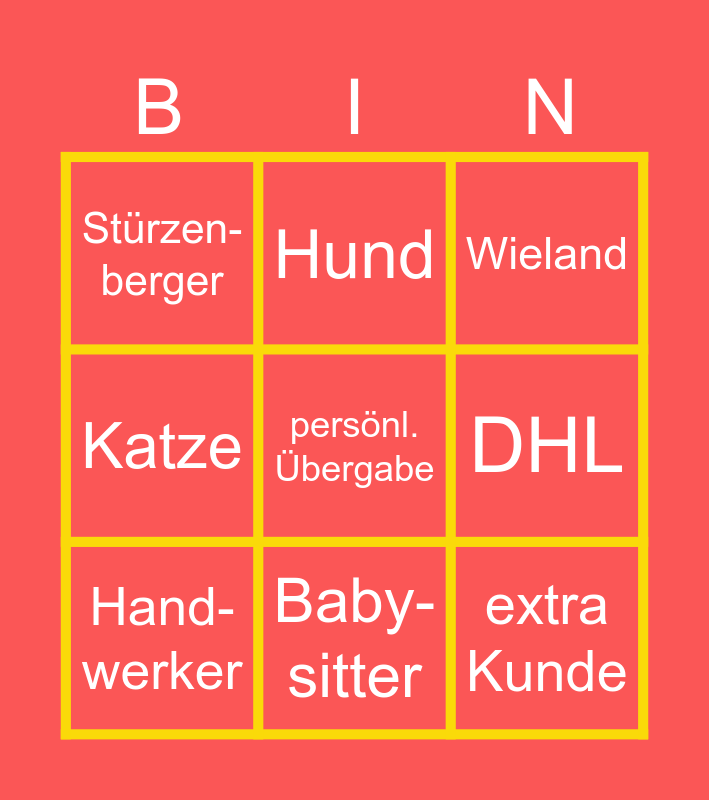 This bingo card has a free space and 8 words: DHL, Wieland, Hund, Hand- werker, Stürzen-berger, extra Kunde, Katze and Baby- sitter.