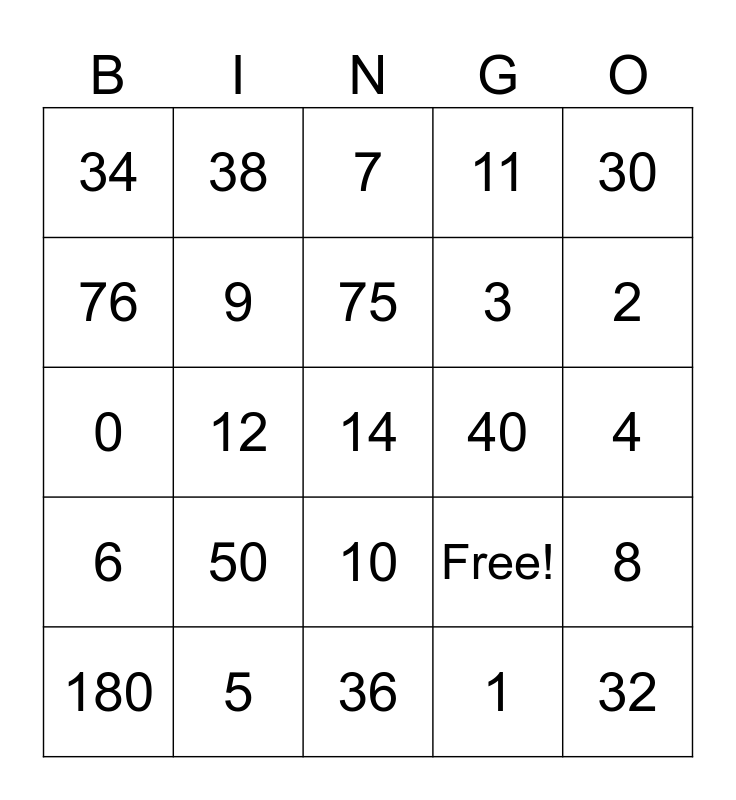 This bingo card has 25 words: 50, 36, 75, 180, 30, 34, 76, 38, 40, 10, 3, 0, Free!, 8, 9, 32, 4, 7, 2, 12, 14, 5, 6, 11 and 1.